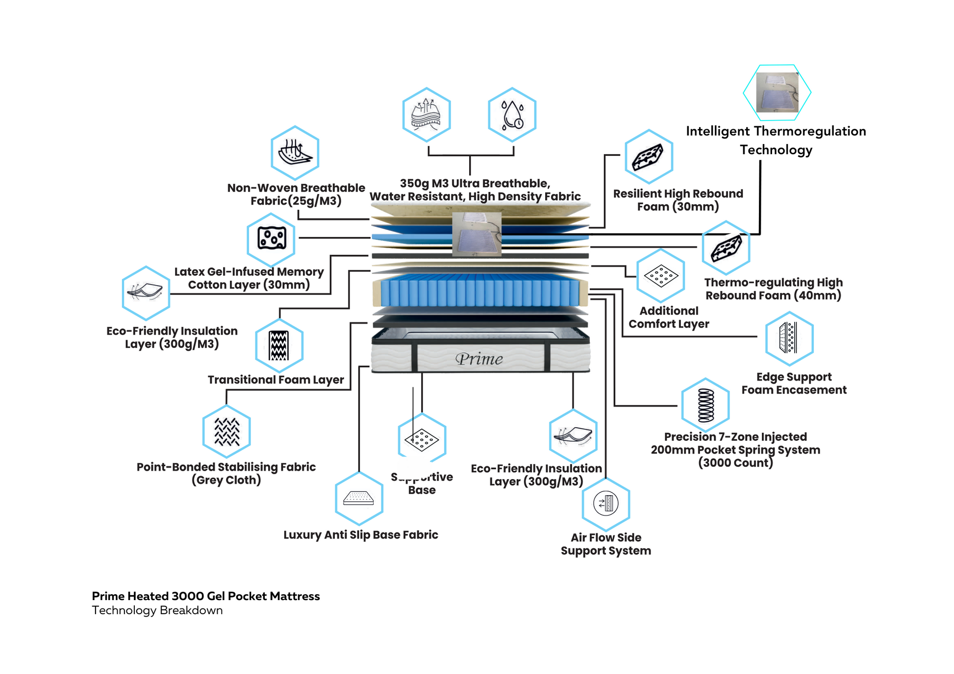 The Prime Heated 3000 Gel Pocket Mattress combines advanced gel pocket technology with intelligent thermoregulation for customised warmth and comfort. Featuring a 7-zone pocket spring system and gel-infused memory foam, it provides targeted support, pressure relief, and soothing heat—perfect for relieving muscle tension and promoting restful sleep. Stay cosy and supported all year round with the ultimate in heated mattress technology.