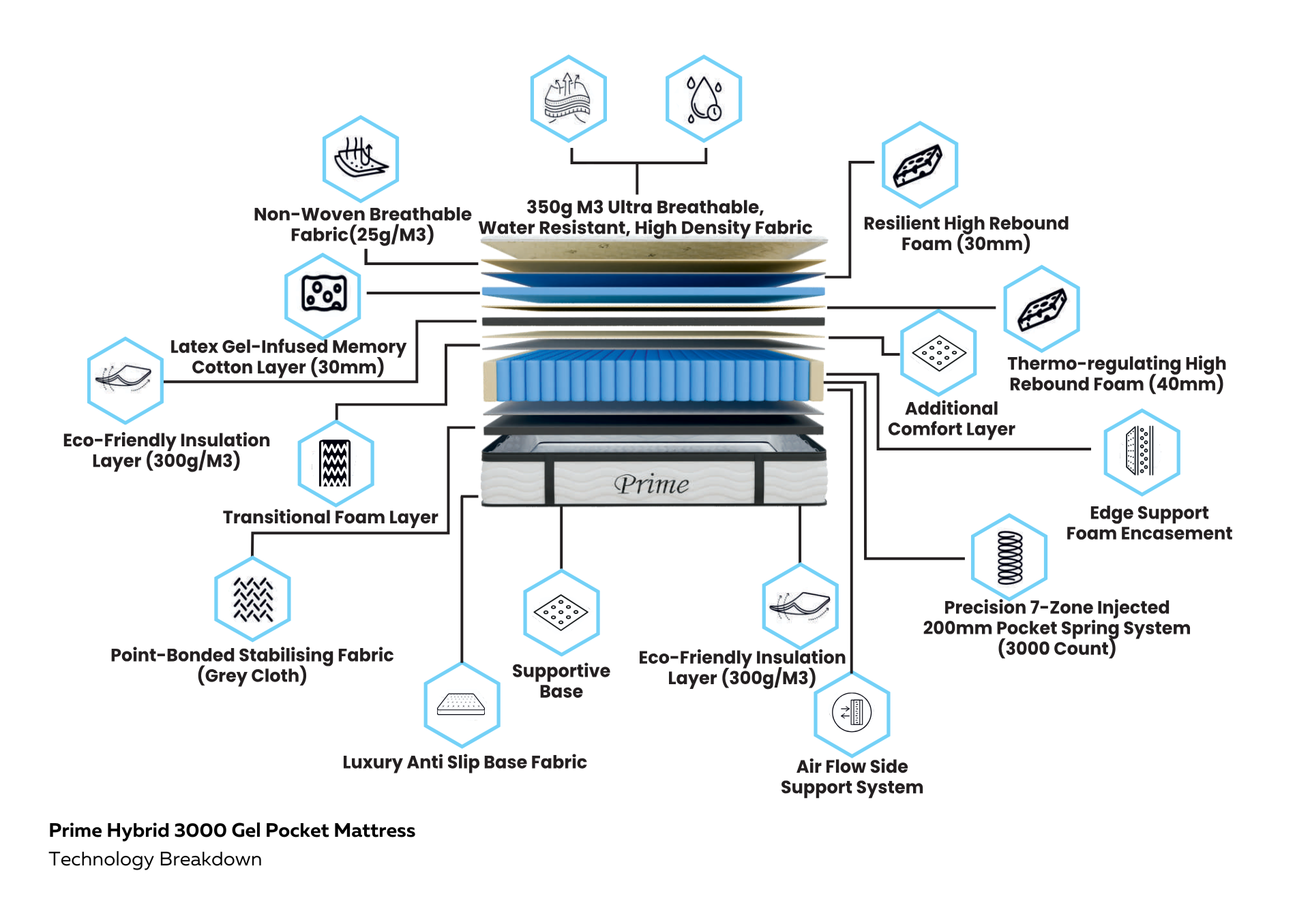 - Innovative Gel Pocket Technology The Prime Mattress features state-of-the-art gel pocket technology, offering targeted support and pressure relief exactly where you need it. Each gel pocket works independently to conform to your body’s unique shape, reducing pressure points and ensuring a restful night’s sleep. This technology not only enhances comfort but also minimises motion transfer, making it ideal for couples.